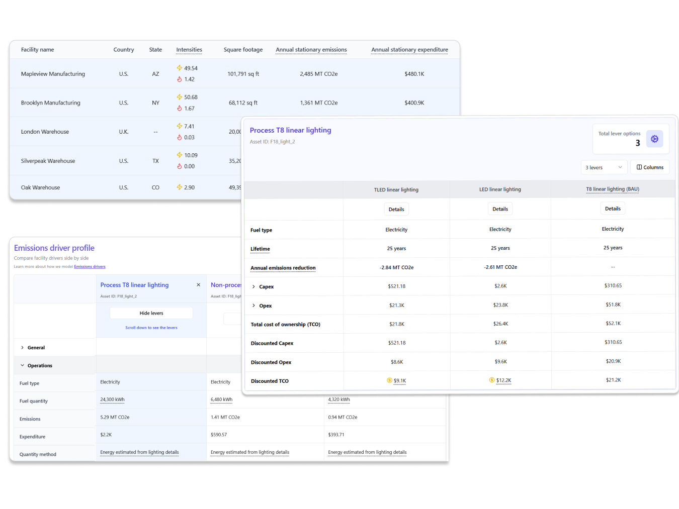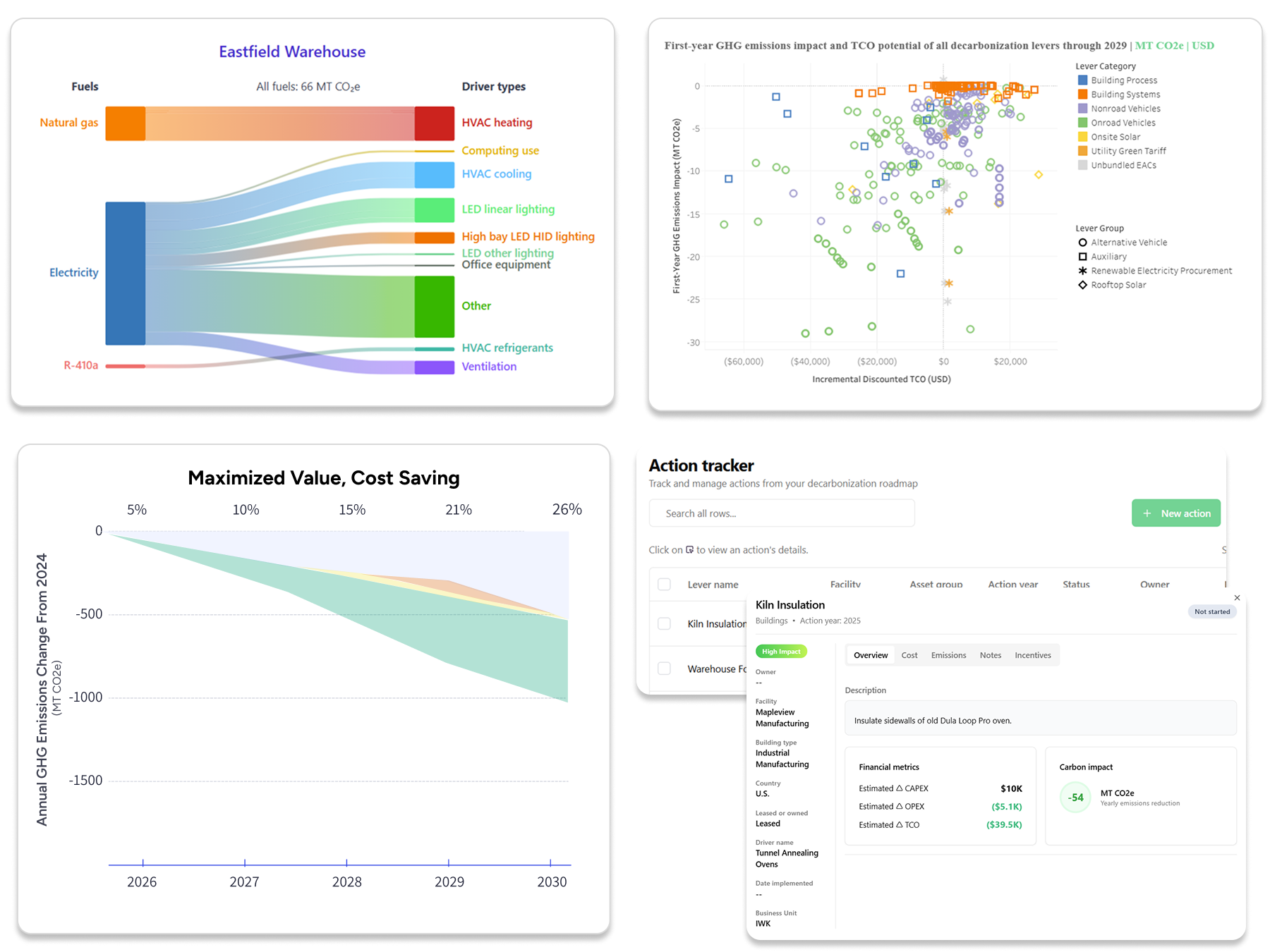 Detailed, prioritized emissions reduction levers and targets with financials; modeled with company constraints and commitments that enable you to achieve operational excellence while reducing carbon.